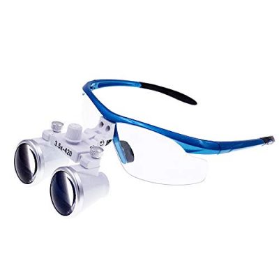 The 3.5X 420 Binocular Loupes Magnifier Glasses provide adjustable angular viewing and come in a stylish blue color. These magnifying glasses are designed for dental lab technicians and dental assistants to improve visibility and make precise work easier. The magnification and lighting provided by these glasses are highly effective, allowing users to see even the smallest details. The glasses are easy to adjust to suit different users and are well-made for durability. However, it's worth noting that the orange light filter shown in the picture is not included. Overall, these loupes are a great investment for professionals in the dental field.