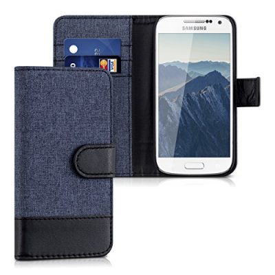 The kwmobile Wallet Case is a stylish and practical phone flip cover designed to fit the Samsung Galaxy S4 Mini. It is made of textile cloth and synthetic leather, providing maximum protection for your device. The case features card slots, allowing you to conveniently store your ATM, credit, insurance cards, and cash with your phone. It also has a stand function that lets you prop up your phone in landscape view, perfect for watching videos and movies. The strong magnetic closure securely holds the cover of your phone together, keeping everything protected. With its dark blue and black color combination, this wallet case offers both style and functionality.