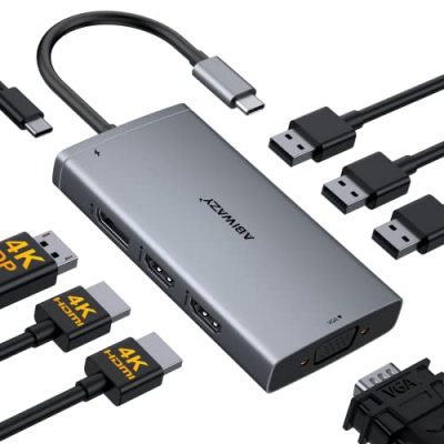 The USB C Docking Station Dual Monitor HDMI is a versatile and efficient laptop hub multiport adapter. With 11 in 1 capabilities, this docking station allows you to extend your USB C port to include dual monitors with 4K HDMI and triple monitors with VGA. It also features Gigabit Ethernet, 3 USB 3.1 ports, 2 USB 2.0 ports, a USB C power charging port, and a 3.5mm Mic/audio port. The docking station has super-speed data transfer ports with transfer speeds up to 5Gbps for USB 3.0 devices and allows for convenient connectivity of keyboards and mice with its USB 2.0 ports. It also supports gigabit Ethernet for a wired connection and features a 3.5mm audio and mic port. Additionally, it includes a USB C card reader and a 100W power charging port for convenience and efficiency. This docking station is compatible with various devices including Dell, HP, Surface, and Lenovo. With its compact and sleek design, it is a great addition to any workspace or for travel use.