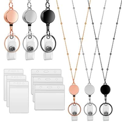 The Retractable Badge Reel Lanyard with ID Holder is a fashionable and practical accessory for anyone who uses an ID card or secure key. This set includes 3 badge lanyards with 6 water-resistant ID holders, 3 name badge clips, and 3 key rings. The ID necklace holders are made of anti-sensitive stainless steel for durability, and the length is adjustable for comfortable wearing. The ID holder can hold up to 5 cards and can be detached from the retractable beaded lanyard if needed. It is suitable for carrying ID cards, keys, cash, and other small items. This retractable ID badge reel lanyard is a practical gift for moms, girlfriends, colleagues, and more.