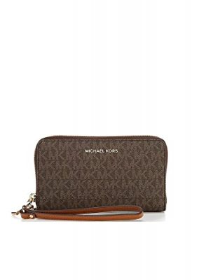 The Michael Kors Jet set Large Flat Phone Case is a stylish and functional accessory designed to hold your phone, cards, and other essentials. Made from MK Signature PVC with Gold-tone hardware, this phone case features a zip-around fastening and a removable wristlet strap. The interior includes one phone pocket, one zip change compartment, one bill compartment, five card holders, and one ID holder. The phone case measures 7" W X 4" H X 1" D, making it the perfect compact size to carry with you on the go. It comes in a brown flat color, and its large size provides ample space for your belongings. With its elegant design and practical features, the Michael Kors Jet set Large Flat Phone Case is a must-have accessory for any fashion-forward individual.