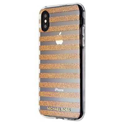 Enhance the look of your iPhone X with the Michael Kors Glitter Stripe Snap-On Case. This sleek and stylish case features a clear design with a rose gold glitter stripe, adding an elegant touch to your device. Made from flexible and high-quality material, it provides excellent protection against drop and impact damage. The rose gold color complements the iPhone X perfectly, giving it a luxurious appearance. The case is easy to snap on, ensuring a secure fit without adding unnecessary bulk to your phone. Upgrade your phone's style and protection with this beautiful Michael Kors case.