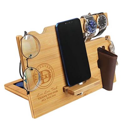 The Wood Phone Docking Station for Dad is the perfect gift for any father. This multifunctional nightstand organizer is designed to keep all personal belongings in one place, making them easily accessible when needed. It features a phone stand, accessory holder, watch stand, key holder, wallet stand, and glasses station, catering to all his needs. Made of high-quality wood with a retro design, it seamlessly fits into any interior decor. The engraved personalization adds a special touch, making it an ideal gift for birthdays, Father’s Day, Christmas, and more. With easy assembly and a 100% risk-free guarantee, this docking station is both practical and thoughtful.