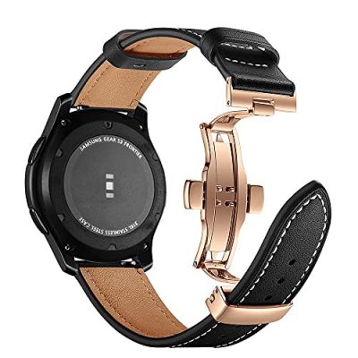 The AISPORTS Compatible for 22mm Samsung Galaxy Watch 46mm/Gear S3 Classic/Frontier Band is a stylish and comfortable wristband designed for Samsung smartwatches. Made with high-quality soft leather, this band is skin-friendly, sweat-absorbent, and wear-resistant. It features an adjustable length and multiple alternative holes to ensure a perfect fit for most wrists. The rose gold butterfly buckle clasp adds a touch of elegance and is made with hypoallergenic stainless steel. The band is easy to install with its watch adapter connector, and no additional tools are required. Compatible with Samsung Galaxy Watch 46mm, Gear S3 Frontier, Gear S3 Classic, and Moto 360 2nd Gen 46mm. Overall, this band combines style, comfort, and durability, making it a great choice for any occasion.