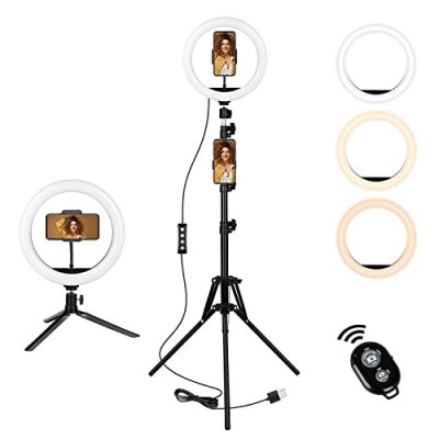 The 10’’ Selfie Ring Light with Stand is a versatile and high-performance lighting solution for live streaming, makeup, YouTube videos, TikTok, and more. With three color modes and 11 brightness levels, this ring light offers a wider range of luminance to suit different user needs. It is 50% brighter than other models on the market and has a long lifetime of over 50,000 hours. The included UL certified USB adaptor ensures stable voltage and maximum light performance. The package also comes with a 60’’ adjustable floor tripod stand, a portable desktop tripod, a wireless Bluetooth remote control, and two phone holders. Both tripods can be used as camera or webcam stands, making it ideal for various user scenarios. With 360-degree rotation capabilities, this ring light provides flexibility in adjusting the light and phone angle. Highly compatible with most cell phones, cameras, and webcams.