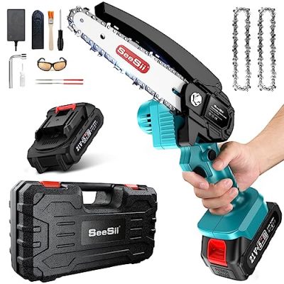 The Seesii Mini Chainsaw is a highly efficient and effortlessly cutting cordless chainsaw designed for various projects such as wood cutting, tree branches pruning, and gardening. With its deeply quenched guide chain design, pure copper motor, and 21V high-power battery, it can quickly cut logs with a diameter of up to 6 inches. The lightweight and compact design make it easy to use with one hand, reducing fatigue even during long-term use. It features a safety lock switch, splash guard, and LED light for added convenience and safety. The package includes a battery, suitcase, chainsaw chains, chainsaw sharpeners, chain oil bottle, gloves, charger, nut driver, and screwdriver. With excellent after-sales service, Seesii ensures customer satisfaction. Overall, the Seesii Mini Chainsaw offers great value and convenience.