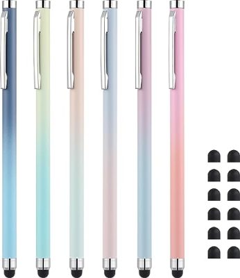 The Stylus Pens for Touch Screens is a set of 6 pens with high sensitivity and a sleek and modern gradient color design. These stylus pens are compatible with all touch screen devices, including tablets, smartphones, and laptops. They come with 6 easy replaceable fiber tips, allowing for extended use without the need for tools. The ultra-sensitive tip reduces smudges and fingerprints on your device's screen. With a well-balanced weight, these pens are comfortable to hold and easy to use for browsing, playing, writing, and drawing. The package includes 6 premium stylus pens, 6 replaceable fiber tips, and an 18-month warranty. With a customer rating of 4.6/5, this set of stylus pens is a great choice for anyone in need of a reliable and stylish touch screen accessory.