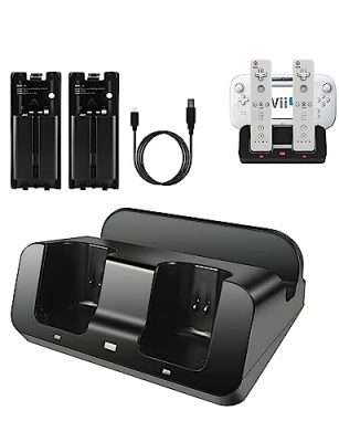 The Tuboopy Wii Controller Charger is a 2-in-1 charging station that allows you to charge your Wii Remote controller and Wii Gamepad controller simultaneously. It comes with 2 rechargeable batteries for the Wii remote, eliminating the need for regular AA batteries. The charger features a built-in LED indicator that shows the charging status, making it easy to recognize. It includes a USB charging cable but requires a 5V/2A wall charger adapter, which is not included. The charger comes in black color and has dimensions of 5.70Lx4.72Wx2.20H. Customers have given it a rating of 4.3 out of 5.