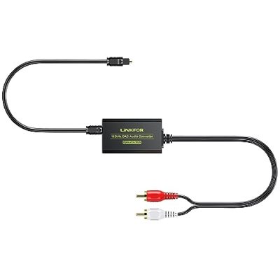 The LiNKFOR DAC Converter is a digital to analog converter that converts optical Toslink digital audio signals to analog RCA L/R audio. It features a built-in audio amplifier chip to amplify the RCA output level and provide clear and pure sound. With a compact and convenient design, it comes with a built-in 1.1m/3.6ft RCA cable, making it easy to connect and install without occupying too much space. This converter is compatible with HD TVs, set-top boxes, DVD/Blu-Ray players, and game consoles. It supports digital PCM or LPCM audio format and has a sampling rate of 192kHz. Please note that it is not compatible with 5.1 channel signals such as Dolby AC3, DTS.