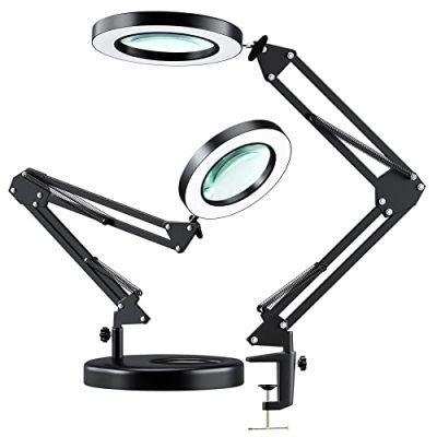 The LANCOSC Magnifying Glass with Light and Stand is a versatile and reliable tool for close work, reading, repairing, sewing, and other crafts and hobbies. It features a 5X 5-inch super large real glass lens that provides clear and undistorted magnification. The LED desk lamp offers 3 light color modes and stepless dimming, allowing you to customize the lighting to your preference. With a sturdy metal clamp, adjustable swing arm, and extendable length, it can be easily positioned and attached to any flat surface. The magnifier with light and stand also ensures eye protection with its ring design and uniformly illuminated viewing area. Overall, it is a high-quality and trustworthy visual aid for various tasks and activities.