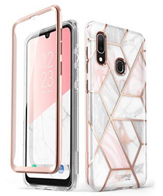 The i-Blason Cosmo Series case is specifically designed for the Samsung Galaxy A20/A30. It features a slim, full-body design with an adorable marble pattern which complements your favorite outfits and accessories. The case is made of flexible and impact-resistant TPU material, providing reliable protection against scratches, scrapes, bumps, and falls. It has been drop tested up to 10 feet. The front cover includes a touch-sensitive built-in screen protector to prevent scratches and cracks. The case also has raised camera and screen bezels for added protection. Precise cutouts allow easy access to all features and buttons, and it is compatible with wireless chargers. However, some users have found the built-in screen protector to be sticky and less responsive. The cutouts for buttons may not align perfectly, and there is no protection for the bottom speaker and charging port. Overall, it is a stylish and durable case that offers good protection for your Samsung Galaxy A20/A30.