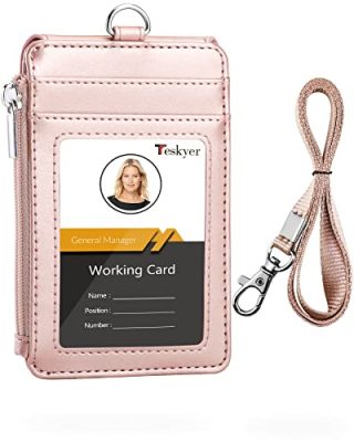 The Teskyer Badge Holder with Side Zip Pocket is a multipurpose ID card holder made of premium PU leather. It features four card slots, including a clear ID window and a side zip pocket. The holder comes with a durable nylon neck lanyard and is suitable for office staffs, teachers/students, couriers, and workers. It allows you to display your work badge while carrying several credit cards, cash, coins, or keys. The lanyard is comfortable to wear, and the holder is compact and lightweight. The design includes a flip cover with a snap button for added protection. The Teskyer Badge Holder is available in various colors.