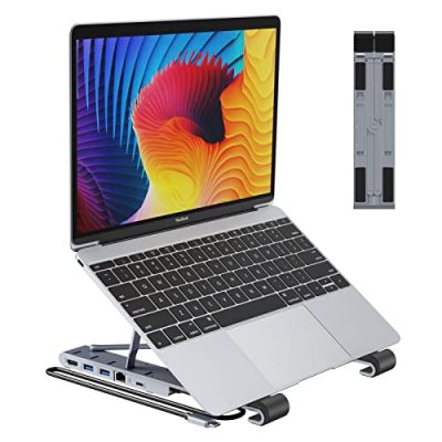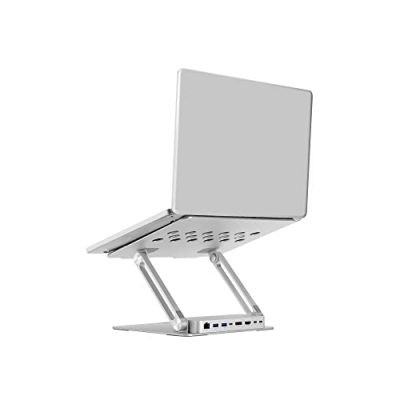 The Laptop Stand with USB Ports is a versatile and ergonomic accessory perfect for enhancing productivity and expanding your workspace. With its 6-in-1 design, this laptop stand serves as a docking station that offers 4K HDMI output, Ethernet connectivity, USB C data transfer, USB C PD charging, and 2 USB 3.0 ports. It supports up to 4K@30Hz video quality and delivers stable high-speed Ethernet speeds up to 1000Mbps. The stand features 5 adjustable angles and heights, promoting a better sitting posture and reducing neck and shoulder pain. Made of high-quality aluminum alloy, it is sturdy and portable. The stand is compatible with various laptop models, ranging from 10 to 15.6 inches. It comes with a 30-day trial period and an 18-month warranty.