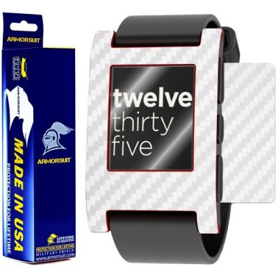 The ArmorSuit Pebble Smartwatch Screen Protector MilitaryShield + White Carbon Fiber Skin Wrap Film Back Protector is a must-have accessory for Pebble Smartwatch owners. This kit includes the MilitaryShield piece(s), Installation Solution, Squeegee, Lint-free cloth, and Installation Instructions. The ultra HD clear and amazingly thin material perfectly matches the contours of your device, providing maximum full coverage on curved corners and edges. Made from scratch-proof, military-grade, and optically clear material, this screen protector and back protector offer complete body and screen protection. The self-healing technology helps to eliminate minor scratches on the film, while also reducing dust, oil, and fingerprint smudges. ArmorSuit ensures 100% satisfaction with a Lifetime Replacement Warranty. Made in the USA, this screen protector is a reliable choice for protecting your Pebble Smartwatch.