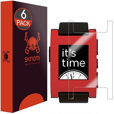The Skinomi Screen Protector is compatible with the Pebble E-Paper Smartwatch and is designed using precise laser cutting technology to provide maximum screen coverage. It is made of flexible thermoplastic urethane that absorbs impact and is resistant against scratches, punctures, and UV light. The installation is easy and bubble-free, and the protector significantly reduces dust, oil, and fingerprints. It is optically transparent with a smooth glass-like surface and offers a true touch feel. The package includes a lifetime warranty and the protector is made in the USA. The only downsides are excessive packaging and the relatively high price.