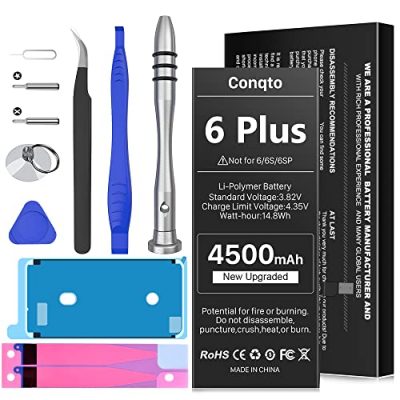 The [4500mAh] Battery for iPhone 6 Plus by Conqto is a reliable replacement battery that offers high capacity and long-lasting performance. With 54% more power life than the original battery, you can enjoy extended usage time for gaming, listening to music, and more without worrying about your battery running out suddenly. The battery has a durable 0 cycle design and can last up to 1000 cycles. It is also equipped with multiple safety protections to prevent over-charging, over-heating, and short-circuiting. Additionally, the battery comes with a full set of professional repair tool kits, making it easy to replace. With great customer service, Conqto ensures that you are satisfied with your purchase. Please note that this battery is only compatible with iPhone 6 Plus models A1522, A1524, A1593.