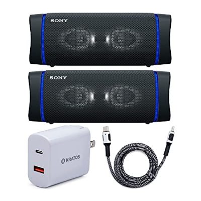 The Sony SRSXB33 Extra BASS Bluetooth Wireless Speaker Bundle offers powerful sound in a portable package. With dual passive radiators and full-range speakers, it delivers deep, punchy bass and high sound quality. The X-Balanced speaker unit enhances the listening experience with richer, deeper tones. The speaker is also waterproof and rustproof, making it perfect for outdoor use. The bundle includes two speakers, a Kratos Power 18W PD Two-Port Power Adapter, and a Kratos Nylon Braided USB-C to USB-C Cable. The only downside is that the speakers cannot sync together for a true stereo experience. Overall, this bundle is a great option for those who want a portable speaker with excellent sound quality and durability.
