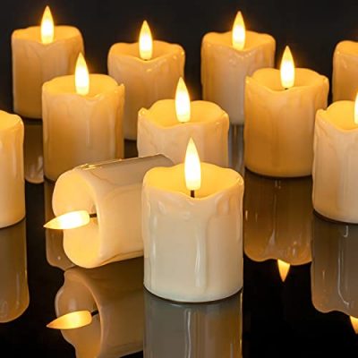 The Lezonic Flameless Votive Candles are a pack of 6 battery-operated candles that provide a realistic and romantic ambiance. Crafted with high-quality wax, these candles have an irregular wavy shape with dripping wax, black wick, and a 3D flickering flame that emits warm white light. The set includes a remote control with 2/4/6/8H timers, allowing you to schedule the candles to turn on and off automatically. Each candle comes with a durable CR2450 coin cell battery that lasts longer than other battery types. These candles are ideal for holidays, parties, weddings, and other home decor. While they are not waterproof and should not be used in high heat areas, they create a realistic candle experience without the worry of fire hazards.