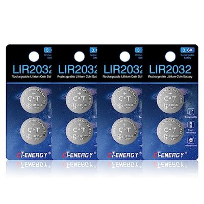 The CT-ENERGY Lir2032 Rechargeable Battery is a pack of 8 3.6V rechargeable CR2032 lithium-ion coin button batteries. With USB fast charging, it takes only 2 hours to fully charge each battery using the CT-ENERGY lithium coin battery charger. These batteries are mercury-free and safe to use in various electronic devices such as car key fob remote control, watches, medical devices, and more. They can be recharged over 500 times, making them a cost-effective and environmentally friendly option. The LIR2032 batteries utilize lithium technology, ensuring high leak-proof performance and a low self-discharge rate. However, they have a lower capacity compared to non-rechargeable CR2032 batteries. Overall, these batteries are ideal for low drain applications.
