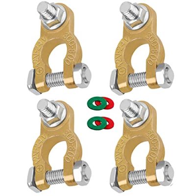 The Battery Terminals Top Post by XIOGZAXI is a set of high-quality battery terminal connectors for cars, motorcycles, and boats. These connectors are made of pure copper, ensuring good electrical conductivity and durability. The package includes 2 pairs of positive and negative marine battery terminals, as well as 2 pairs of anti-corrosion gaskets to prevent battery corrosion. The bolts of the terminals are manufactured according to DIN standard with an M8 diameter, making them easy to install and identify with their (+) and (-) markings. These top post connectors are suitable for 12v/24v batteries, and their easy installation and removal make them convenient to use. Overall, these battery terminals offer excellent performance and reliability, making them a great choice for automotive and marine applications.