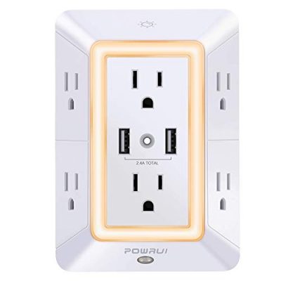 The USB Wall Charger Surge Protector by POWRUI is a versatile and space-saving power strip that also functions as a USB outlet and night light. With 6 adapter spaced outlets and 2 USB charging ports, this power strip provides plenty of room for all your devices. The 3-sided design and larger spacing between outlets make it easy to use with any equipment. The built-in night light has adjustable brightness levels and turns on automatically in low lighting conditions. The reliable surge protector circuit ensures the safety of your devices. This product is ETL certified and comes with a 30-day return and 12-month replacement warranty. Overall, it is a convenient and well-made solution for all your charging needs.