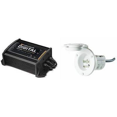 The Johnson Outdoors MinnKota MK 315D On-Board Battery Charger and Minn Kota 1865110 MKR-23 Saltwater AC Power Port Marine Battery Accessory make a powerful combination for marine enthusiasts. With 3 banks and 5 amps per bank, the charger offers multi-stage charging and automatic temperature compensation. It is saltwater tested and fully corrosion-resistant, backed by a three-year warranty. The power port marine battery accessory allows for quick and easy connections to an AC extension cord without any cutting or splicing. The watertight cover and gasket prevent corrosion on the AC plug when not in use. It comes in a sleek white color.