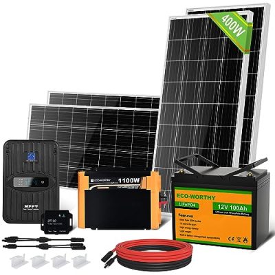 The ECO-WORTHY 1.6KWH Solar Panel Kit is a complete off-grid power solution that is ideal for RVs, sheds, cabins, and homes. With a daily power output of 1.6KWH, it can power various AC 110V devices like TVs, air conditioners, water heaters, refrigerators, coffee makers, and microwaves. The kit includes 4*100W mono solar panels, a 60A MPPT controller, a 12V 100Ah lithium battery, and a 1100W power inverter. The panels are made of durable aluminum frame and tempered glass, with an IP65 waterproof rating. The lithium battery has a lifespan of over 10 years and comes with a built-in battery management system to prevent overcharging and overheating. The power inverter has a high conversion efficiency of 95% and a pure sine wave design. Overall, the ECO-WORTHY 1.6KWH Solar Panel Kit is a reliable and efficient off-grid power solution.