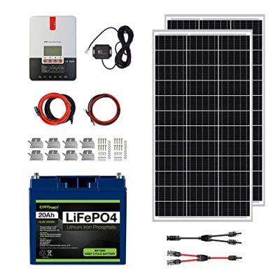 The ExpertPower 200W 12V Solar Power Kit is a comprehensive off-grid solar system perfect for RVs, trailers, campers, marine use, and solar projects. It includes a high-quality LiFePO4 battery with a long lifespan and built-in battery management system for optimal protection. The kit also includes two 100W monocrystalline solar panels, a 20A MPPT solar charge controller with Bluetooth, and all necessary cables and mounting brackets. The system has smart technology that adjusts charging profiles based on ambient temperatures and features a digital display for easy monitoring. With its easy setup and reliable performance, this solar power kit is a great option for those looking to harness the power of solar energy.