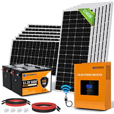 The ECO-WORTHY 9.4KWH 2340W 48V Off Grid Complete Solar Panel Kit is a powerful and efficient solution for homes, sheds, cabins, farms, and other energy backup needs. It comes with 12pcs 195W solar panels, 2pcs 48V 50AH lithium batteries, and a 5000W 48v all-in-one MPPT charger inverter. With an ideally output of 9.4KWH per day under 4 hours of full sunshine, this kit can power AC appliances, TVs, refrigerators, coffee makers, and more. The solar panels are durable with an aluminum frame and tempered glass panel, while the IP65 waterproof design ensures resistance against high winds and snow loads. The hybrid solar charger inverter allows for off-grid and grid charging, providing all-weather use and protecting appliance life. The kit also includes metal shell batteries with a lifespan of over 10 years. With a 1-year warranty and warm after-sales service, this solar panel kit offers great value and performance.