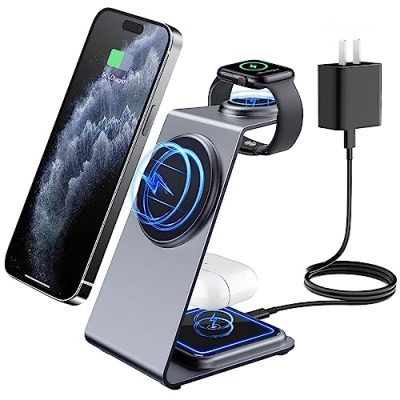 Charge multiple Apple devices simultaneously with the LEKOYE 3 in 1 Wireless Charging Station. It is compatible with various iPhone models, Apple Watches, and AirPods. The charging station features fast wireless charging and multiple safety protections. The magnetic design ensures a secure hold for your iPhone. It is user-friendly with an aluminum alloy construction, indicator lights, and anti-slip silicone on the base. You will receive the charging station, a USB-C to USB-C cable, 20W adapter, and 12 months warranty. Say goodbye to messy cables as you conveniently charge all your Apple devices in one place.