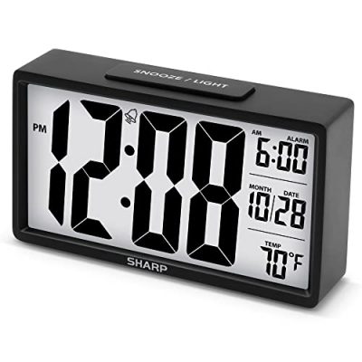 The SHARP LCD Display Digital Alarm Clock is a small and light battery-operated alarm clock with a clear and easy-to-read blue backlight LCD screen. It features an ascending alarm and a top-mounted snooze button for extra sleep time. With easy set top button controls, it can be used anywhere you need a clock. The clock is powered by 2 – AAA batteries and is perfect for kids, teens, or as a basic bedside table desk gift alarm clock.
