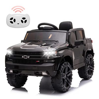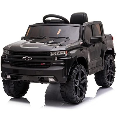The Kidzone 12V Battery Powered Licensed Chevrolet Silverado Trail Boss LT Kids Ride On Truck Car Electric Vehicle Jeep is the perfect toy car for your little one. It features a stylish design inspired by the real Chevrolet Silverado Trail Boss, complete with LED lights, startup sounds, and openable doors for an authentic driving experience. The car is made with durable and non-toxic plastic, ensuring safety and reliability. It has a smooth and safe driving experience with wear-resistant wheels and a shock-absorbing suspension system. With its realistic operation, your toddler can feel the thrill of starting his own car. The car is also powerful and rechargeable, offering up to 1-2 hours of playtime. It even comes with Bluetooth wireless technology and MP3 for added entertainment. With its adjustable seat belt, lockable doors, and maximum weight capacity of 66 lbs, this ride-on car is suitable for kids aged 37-72 months.