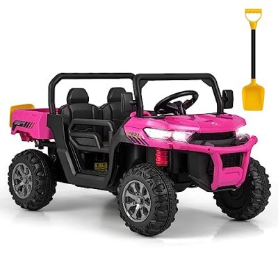 Experience the joy of transport with the OLAKIDS 2 Seater Ride On UTV. This 12V kids electric vehicle features an auto-lifting dump bed and an extra shovel, allowing children to have a realistic transportation experience. Safety comes first with the soft start function, 2 wheels spring suspension, and two driving modes (foot pedal and 2.4GHz remote control). The ride on car also offers multiple attractive functions such as built-in music, speed change, rocking mode, horn buttons, and battery indicator. With a stable and durable construction, it can hold up to 110 lbs. The OLAKIDS 2 Seater Ride On UTV is DOE & CEC Certification Approved and made of non-toxic materials. Suitable for kids over 3 years old.