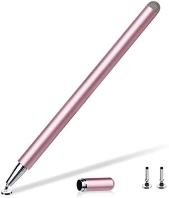 The Stylus Pens for Touch Screens, LIBERRWAY Disc Stylus Pen Fiber Stylus with Magnetically Attached Cap, Compatible with iPad iPhone Chromebook, Rosegold is a versatile and practical stylus pen that works with all touch screens. It offers accurate tips for precise writing, calculations, and detailed drawing. The stylus can work smoothly without delay, protecting your screen from fingerprints and scratches. Made of lightweight aluminum alloy, it is comfortable to hold and doesn't require charging or Bluetooth connectivity. With a magnetic cap, the stylus pen is easy to store and keep secure. It comes with a 1-year warranty and makes a great gift for family and friends.