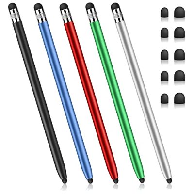 The Stylus Pens for Touch Screens is a 5-pack of stylus pens designed for various touch screen devices. With 2 different sizes of rubber tips and a 2-in-1 design, it allows for precise clicking, sliding, and other actions. The rubber tips are anti-scratch and suitable for use with capacitive touch screens, making it great for studying, drawing, and playing games. The stylus pens are compatible with a wide range of devices including iPad, iPhone, Android, Chromebook, and more. The package includes 5 stylus pens in different colors and 5 pairs of replaceable rubber tips. The metal body and frosted texture give the stylus a stylish look. With free technical support, replacement service, and a money-back guarantee, this stylus pen set offers a great value for its price.