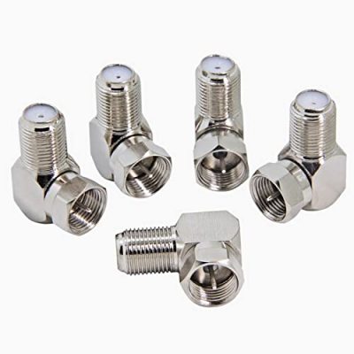 The Right Angle Coax Connector is a 5-pack of F Type 90 Degree Coaxial Male to Female Cable Connectors. It is designed to work with coaxial cables on various devices such as TV, modem, internet router, cable TV amplifier, Set-Top Box (STB), and satellite receiver. This connector is particularly useful for wall-mounted flat TV installations, allowing the coaxial cable to be flat against the wall without unsightly bends or stress on the cable connectors. Made with high-quality copper material and a nickel-plated body, this connector ensures extremely low signal loss. It is compatible with RG58, RG59, RG6, and RG11 coaxial (75Ohm) cables. The package includes 5 connectors, providing you with a backup option. The Right Angle Coax Connector also comes with a worry-free warranty and friendly customer service for 12 months.