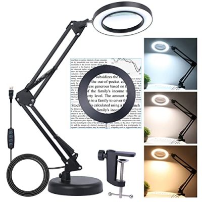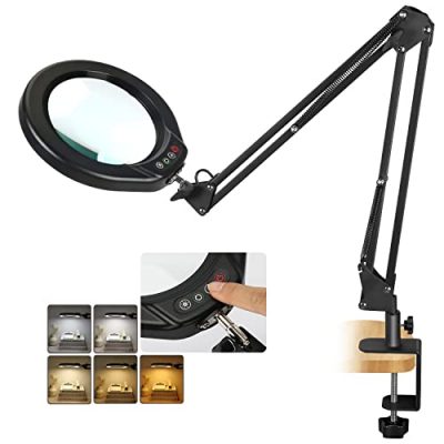 The VEEMAGNI 5 Inch Large Magnifying Glass is a versatile and user-friendly tool for close work, crafts, hobbies, and soldering. With its switch in the head design, you can easily adjust the light settings without bending down. The magnifier features a 5-inch large glass lens that offers 5X magnification with no distortion and true color performance. It also comes with adjustable lighting, including 5 color modes and 10 dimmable brightness settings. The lamp is equipped with an upgraded clamp and adjustable swing arm, allowing you to securely mount it on various tables and positions. It is an ideal gift for people with vision problems and macular degeneration. With a customer rating of 4.6/5, this magnifying glass with light and stand is a reliable and affordable option for your magnification needs.