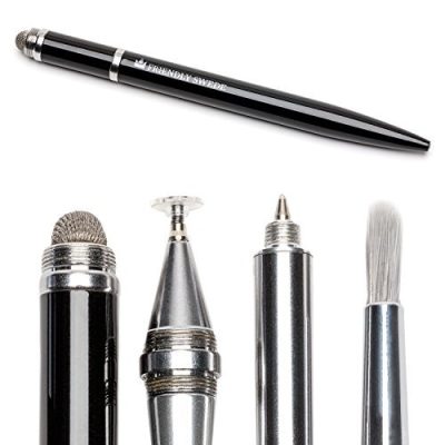 The Friendly Swede Capacitive 4-in-1 Stylus Pen with Replaceable Brush, Fiber Tip, Precision disc + Ballpoint Pen in Gift Box is the ultimate stylus for all your touchscreen devices. With a micro-knit fiber tip, precision disc, exclusive brush tip, and ballpoint ink pen, this stylus has it all. The replaceable and convertible tips allow for customization and versatility. Made with a solid aluminum body, it feels great and luxurious in your hand. Compatible with all capacitive screen devices except for iPad Pro 12.9 and Microsoft Surface. The stylus comes in a beautiful gift box and is backed by The Friendly Swede's Lifetime Warranty. Overall, it's a high-quality stylus with multiple functions and great craftsmanship.
