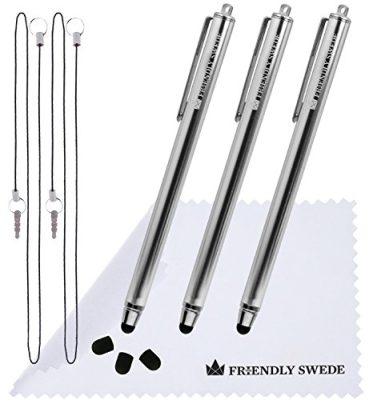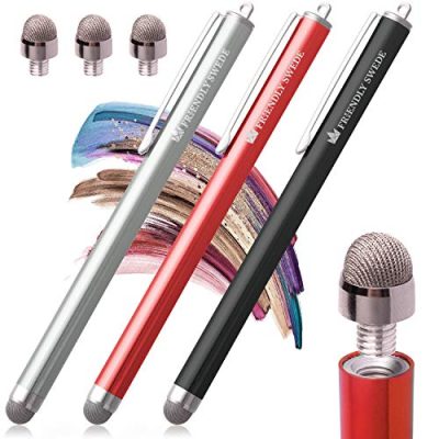 The Friendly Swede Micro-Knit Mesh Tip Capacitive Stylus Pens are perfect for typing, drawing, and gaming on touchscreen devices. The fine micro knit tips ensure smooth gliding across the screen while protecting it from fingerprints, dirt, and scratches. These styli are durable and qualitative with aluminum and steel bodies, and the micro-knit fiber tips are replaceable. The styli are compatible with all capacitive screens and are great for use with gloves. The bundle includes three stylus pens, replacement tips, detachable elastic lanyards, and a microfiber screen cleaning cloth. Users choose The Friendly Swede for their digital drawing, gaming, and scrolling needs, as the company offers a lifetime warranty. Overall, these stylus pens are a great value and highly recommended.