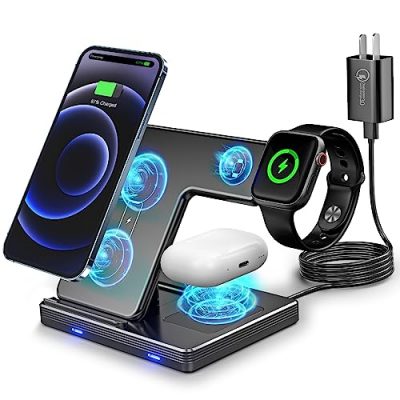 The WAITIEE Wireless Charger 3 in 1 is a convenient and stylish charging station for Apple devices. With fast charging capabilities and multiple protection mechanisms, it ensures efficient and safe charging for your devices. The non-slip and tilt angle design provides a secure grip and optimal viewing angles. While it may require an Apple charger for Watch charging and has some challenges with cord management, overall it offers a sleek and efficient solution for charging multiple devices at once. Whether you need to charge your iPhone, AirPods, or Apple Watch, this wireless charger station has got you covered.