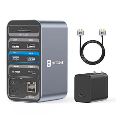 The TOBENONE USB C Docking Station is an exclusive design for MacBook Pro/Air users. It offers a powerful expansion with 15 different ports, including dual 4K HDMI, USB 3.0 and 2.0 ports, USB-C, SD/TF card reader, audio jack, and Ethernet. The docking station provides versatile dual 4K extended monitor capabilities, making it great for graphic work, video editing, and more. It is powered by a 65W GaN Charger for efficient and stable charging. The USB C dock is plug-and-play, no drivers required, and comes with a 2-year warranty. With its reliable Ethernet connection and additional connection options like an SD/TF card reader, this docking station is a convenient and feature-rich solution for MacBook Pro/Air users.