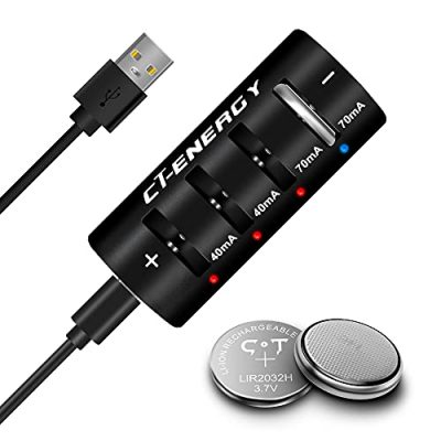 The CT-ENERGY Lithium Rechargeable Coin Cells Battery Charger is a versatile and efficient charger for a variety of rechargeable batteries. It features USB fast charging ports with two options for standard and high current charging. The charger is compatible with LIR1632/2025/2032/2032H batteries and utilizes lithium battery technology, ensuring no memory effect and high leak proof performance. With quick and easy charging, it only takes 2 hours to fully charge the batteries. The charger has dual LED indicators to show the charging status. The package includes 4-pack CT-ENERGY LIR2032H rechargeable batteries, which can be recharged more than 500 times. The LIR2032H batteries are mercury-free and can be used in various electronic devices. Overall, this product provides a cost-effective and eco-friendly solution for powering your electronic devices.