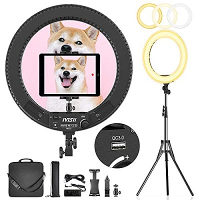 The IVISII 19 inch Ring Light is a professional-quality lighting solution for live streaming, makeup tutorials, YouTube videos, TikTok content creation, Zoom meetings, and photography. It comes with a remote controller, stand, iPad holder, and 4 color soft filters. The LED light offers adjustable brightness from 0% to 100% and includes 4 different color filters. With a smart LCD display, ultrathin design, and all-around heat dissipation, it provides accurate color rendering and longer working time. The ring light is compatible with most DSLR cameras and smartphones. It offers dual power supply options and comes with a wireless remote controller for easy control of brightness and color temperature settings. The IVISII 19 inch Ring Light is a versatile and reliable lighting solution for professionals and amateurs alike.
