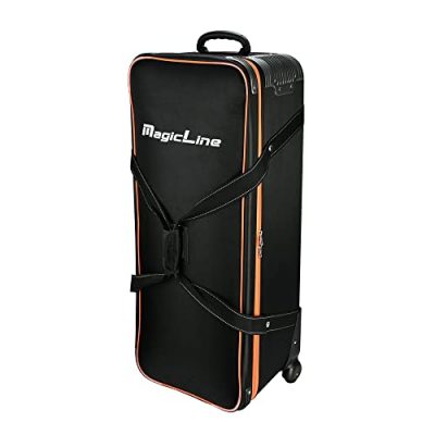 The MagicLine Studio Equipment Trolley Case is a durable and spacious bag designed for photographers and videographers. It features extra reinforced armors on the corners for added strength, with a load capacity of 110.2 lbs. The adjustable lid straps keep the bag open and accessible, while the removable padded dividers and inner zippered pockets provide convenient storage options. Made from waterproof 1680D nylon cloth and equipped with premium quality wheels, this trolley case is perfect for carrying light stands, tripod, strobe light, umbrella, softbox, and other accessories. Its external size is 39.4"x14.6"x13" and it weighs 14.8 lbs. The case comes in a stylish black/orange color. Overall, it is a reliable and spacious option for professionals on the go.