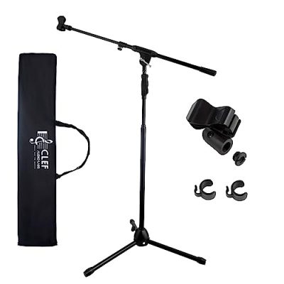The Clef Audio Labs Boom Mic Stand is a heavy-duty tripod microphone stand that is perfect for vocal performances at home, stage, and studio. It features adjustable, non-slip positioning with premium rubber foot caps to reduce vibration. The one-hand height adjustment clutch and anti-rotation shaft make it easy to adjust the height mid-performance. This professional-quality tripod stand is made of thick steel construction, making it durable and easy to clean. It is compatible with all standard microphones and comes with a mic clip, cable management clips, and a convenient carrying case. With its compact and portable design, it is ideal for musicians, singers, rappers, poets, and public speakers. The stand has received a customer rating of 4.3 out of 5.
