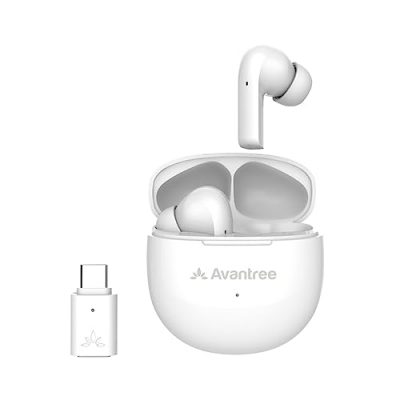 Experience supreme sound quality and low latency with the Avantree Reverb True Wireless Earbuds. Featuring a 10mm Graphene driver and aptX Adaptive technology, these earbuds deliver immersive sound with powerful bass. The low latency of 80ms ensures a synchronized audio and visual experience, perfect for gaming and watching videos. With a battery life of 7 hours (30 hours with the charging case), you can enjoy music throughout the day. The built-in cVc 8.0 noise-filtering and aptX Voice technology guarantee crystal clear calls. The earbuds are compatible with various devices thanks to the included USB C dongle and USB adapter. Simply plug and play, or connect via Bluetooth. Upgrade your audio experience with the Avantree Reverb True Wireless Earbuds.