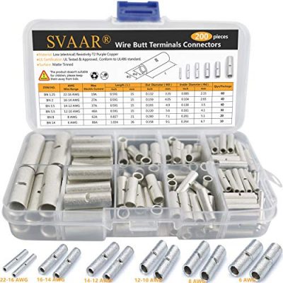 The SVAAR 200pcs Butt Connectors Kit is a versatile and reliable solution for electrical wire connections. Made of matte tinned copper, these butt connectors offer excellent conductivity and corrosion resistance. They feature a safer design with a wire stop barrier to prevent wire slipping and conform to UL486 standard for durability. With chamfered barrel ends and built-in wire stop, they are easy and safe to use. The kit includes 6 different sizes of connectors to meet various needs. These connectors are ideal for automotive, marine, and other electrical applications. The kit comes with 200pcs of uninsulated butt connectors in a range of wire sizes, ensuring you have the right connector for your job. Overall, it is a high-quality kit that provides reliable wire connections.