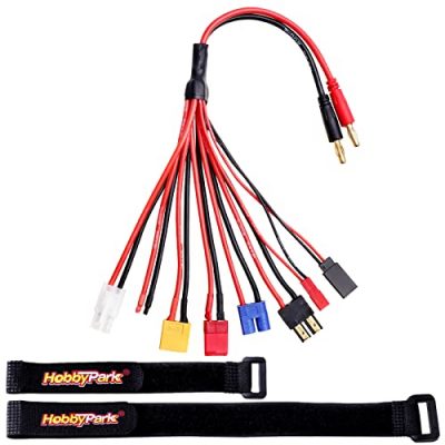 The Hobbypark RC Lipo Battery Charger Adapter Connector Splitter Cable is a versatile and convenient solution for RC enthusiasts. It comes with 8 different connectors, including T-Plugs Deans, TRX, Big Tamiya, XT60, EC3, JST, Futaba, and DIY Bare Wire. This 8-in-1 cable allows you to easily charge different types of batteries without the need for multiple chargers or adapters. The cable is made of 14 gauge silicone wire with a tin-plated copper conductor, ensuring low resistance and secure connections. Additionally, it includes 2 battery straps for added convenience. The Hobbypark RC Lipo Battery Charger Adapter Connector Splitter Cable is perfect for aircraft drone models, RC cars, trucks, planes, axis aerial devices, batteries, and airsoft. It is a reliable and durable product from HobbyPark RC.