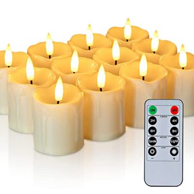 The Lezonic Flameless Votive Candles are a pack of 6 battery-operated candles that provide a realistic and romantic ambiance. Crafted with high-quality wax, these candles have an irregular wavy shape with dripping wax, black wick, and a 3D flickering flame that emits warm white light. The set includes a remote control with 2/4/6/8H timers, allowing you to schedule the candles to turn on and off automatically. Each candle comes with a durable CR2450 coin cell battery that lasts longer than other battery types. These candles are ideal for holidays, parties, weddings, and other home decor. While they are not waterproof and should not be used in high heat areas, they create a realistic candle experience without the worry of fire hazards.