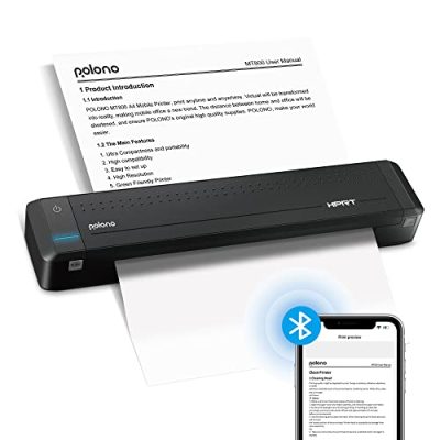 The POLONO MT800 2.0 Wireless Bluetooth Thermal Printer is a portable printer that is perfect for travel, mobile office, and home use. It features high-resolution printing on 8.5" x 11" paper, automatic paper feeding, and 300dpi resolution for clear documents. The printer is compatible with both Android and iOS devices via Bluetooth connection, as well as MAC and Windows laptops and iPads. It has a built-in 2600mAh battery that provides 26 hours of standby time and can print 70 copies in a single charge. The printer is small and portable, about the size of an iPhone, making it convenient for printing on the go. It uses thermal transfer printing technology, eliminating the need for ink, and is environmentally friendly. Overall, the POLONO MT800 2.0 Wireless Bluetooth Thermal Printer is a great option for anyone in need of a portable printer.